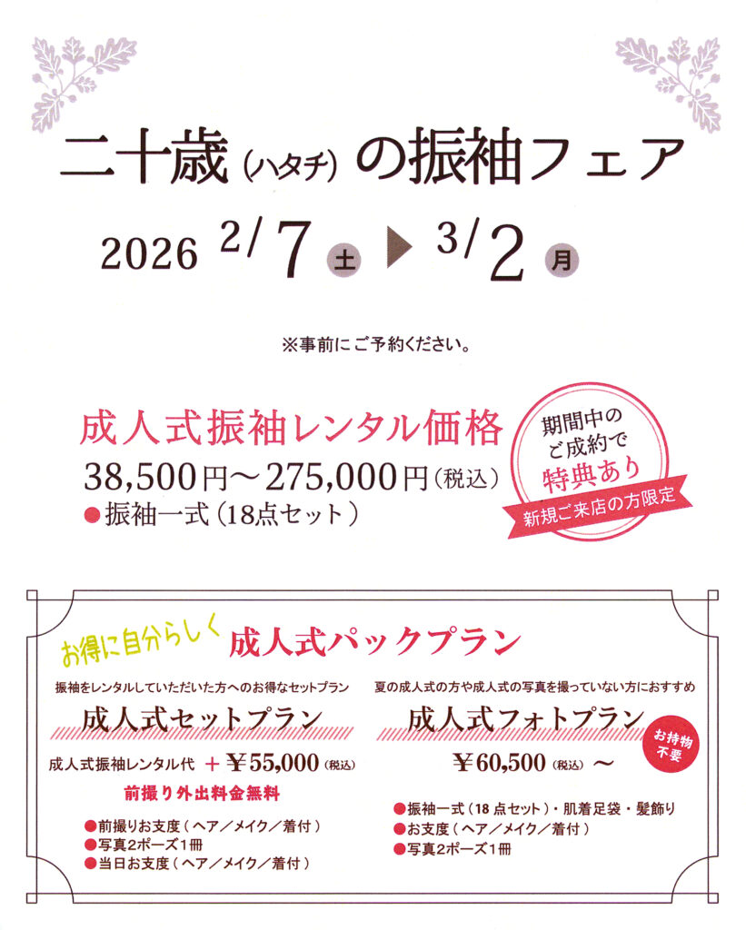 提携している衣装会社の新年度の二十歳の振袖フェアを開催中です
